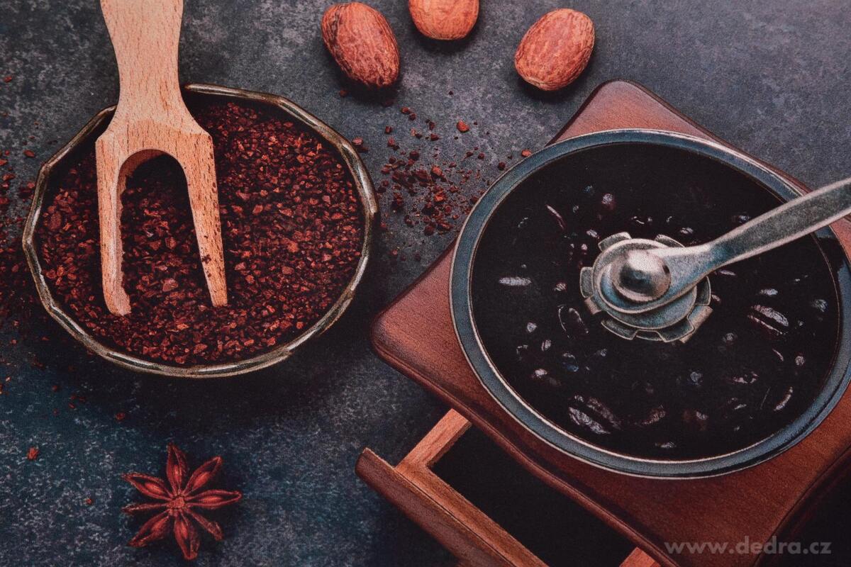 SPA – ultrasavý křemelinový běhoun 120 × 40 cm s motivem kávy a koření. Rychleschnoucí, protiskluzový a antibakteriální. Praktický a elegantní doplněk do koupelny, kuchyně, předsíně či wellness.