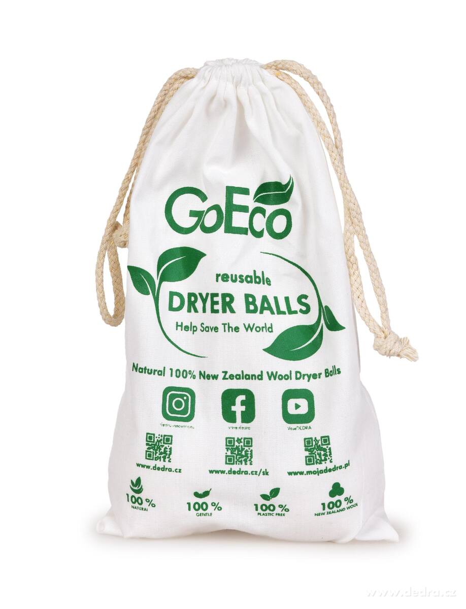 GoEco® SUŠIČKOKOULE – sada 3 ks z pravé ovčí vlny šetří čas i energii při sušení prádla (zkracují proces až o 20 %). Opakovaně použitelné místo jednorázových ubrousků, nezanechávají vlákna, lze je provonět parfémem na prádlo. V praktickém bavlněném sáčku.